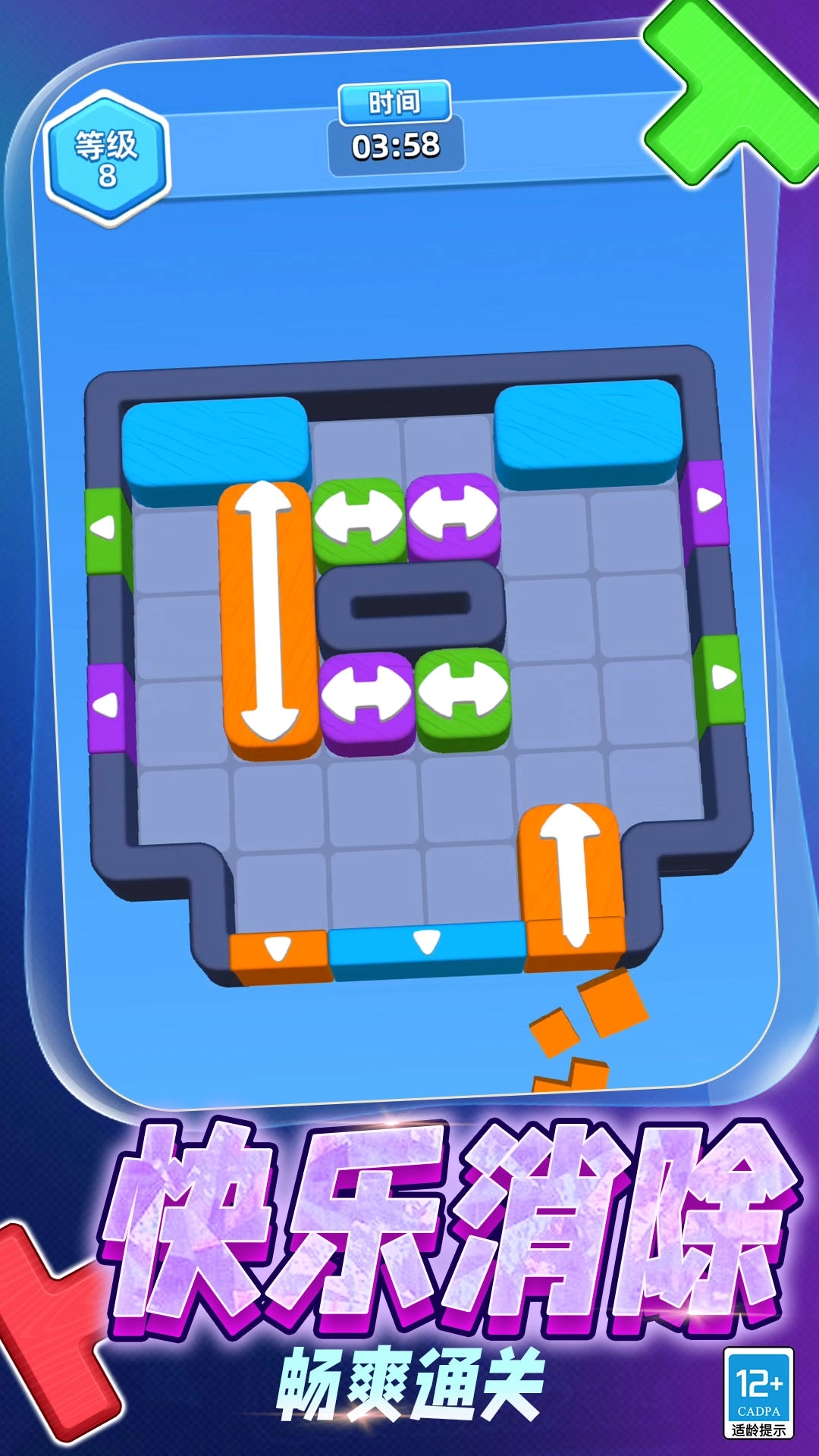 1、动动手指就能玩的消除游戏,玩家要把彩色积木块移来移去,凑成同色块就能让它们消失,玩起来轻松又解压。
