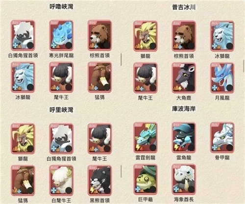 从(1-9)库波海岸到(2-9)第二大陆最后一张图普吉塔冰川,Boss的属性依次为电火、冰地、地冰、地电、冰火;以下是部分Boss的相关信息节选: