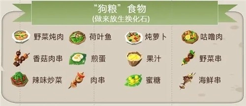 到了游戏后期,大部分玩家手里已经攒下不少食材了,这时候可以批量制作那些对稀有食材需求较低的食物来囤积狗粮,做出来的宠物还能通过放生换取化石用于升级。
