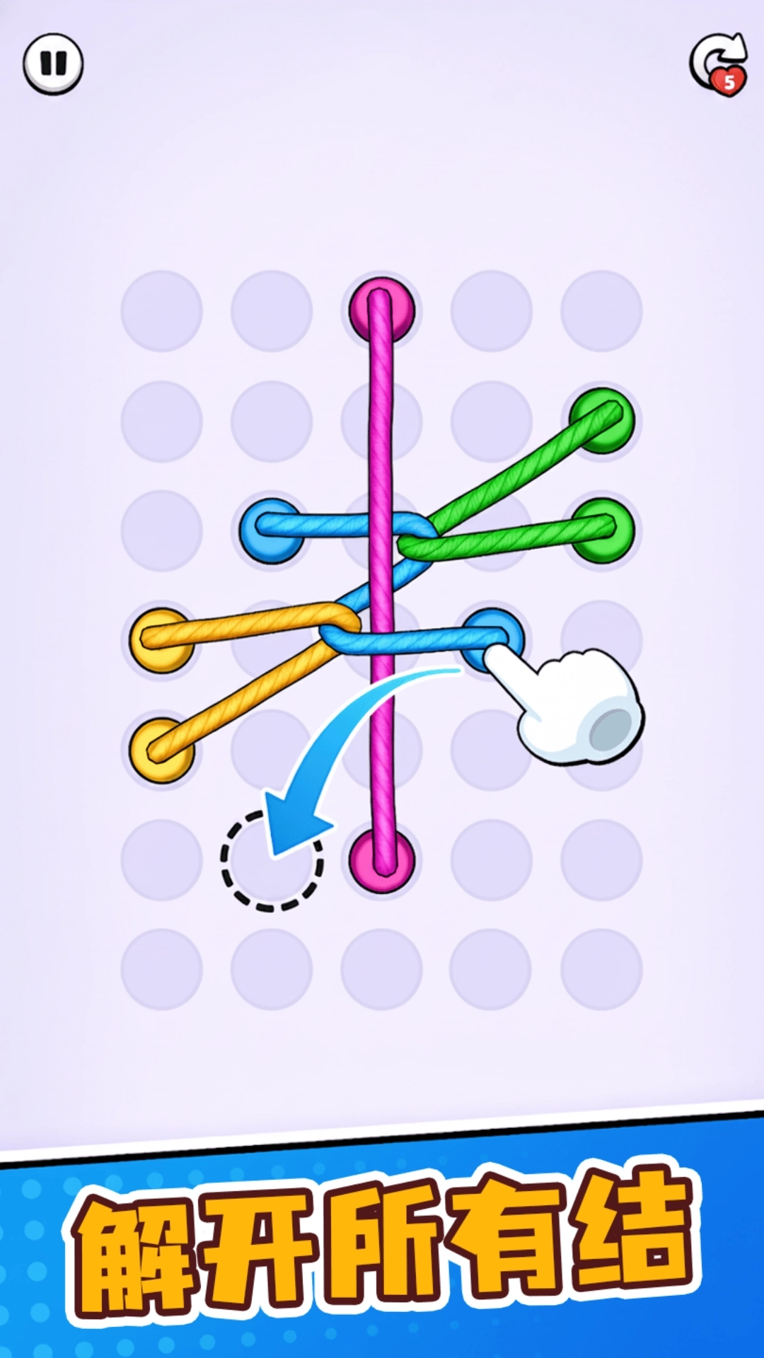 1、玩家需通过拖动绳头、旋转节点或剪断绳索,将缠绕的绳结逐步解开,使每根绳子回归顺畅路径;