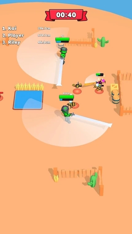 旋转刀刃(BladeSpinIO)游戏中的角色都拥有一把长刀,通过消灭敌人的方式,可以让自己的长刀变得更长,攻击范围就会变得更大。在画面的左侧有一个排名系统,玩家可以看到自己的战斗力排在第几名,这样就能实时掌握战场情况!