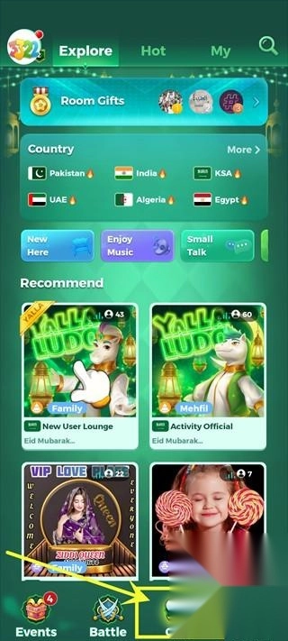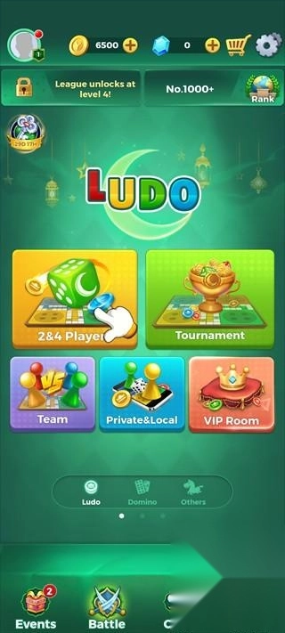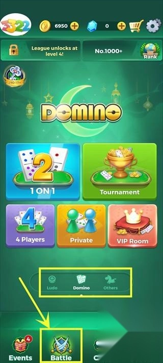 1、首先在本站下载并安装Yalla Ludo,安装完成后打开游戏。进入游戏后默认显示的是Battle(对决)页面,玩家在这个页面可以选择Ludo、Domino、Other三种不同的玩法。