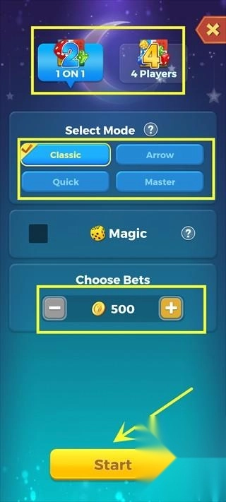 Ludo包含两种模式,分别是1对1模式与4人模式。这两种模式下均设有经典、大师、快速和魔法这四种不同类型的游戏玩法。