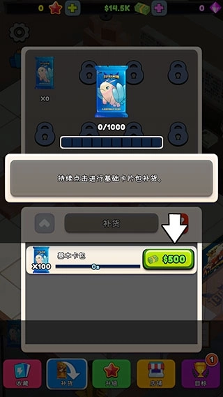 1、首先我们点击下方的【补货】按钮,为商店补充卡包库存。