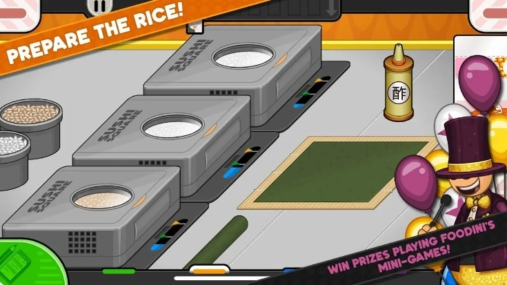 ◆老爹寿司店有两个阶段去准备完美的寿司饭。首先你要等米饭蒸孰。当烹饪计达到绿色箭头时,米饭就蒸好了。然后你需要将一些寿司醋倒入寿司米。这将开始混合过程。