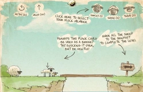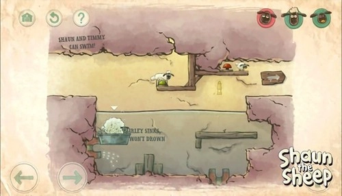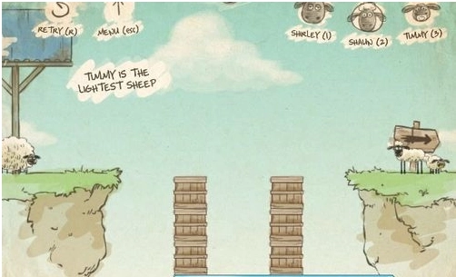 第1关:母羊带着小羊走到木头旁,推上几下,刚好能让木板横在悬崖上变成独木桥,三只羊过桥就可以了。