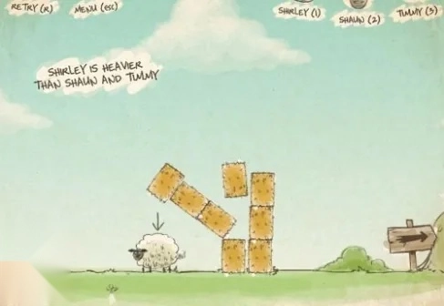 第5关的通关技巧有两种:一种是让三只羊依次跳跃,关键在于它们腾空时微调方向,尽量保持垂直下落,这样能降低箱子的晃动幅度;另一种则更简单直接——让三只羊叠成罗汉,小羊站中羊背上,中羊站大羊背上,接着让大羊起跳。只要力度和起跳位置控制得当,就能让箱子刚好倾倒却挤在一起,不会掉落。