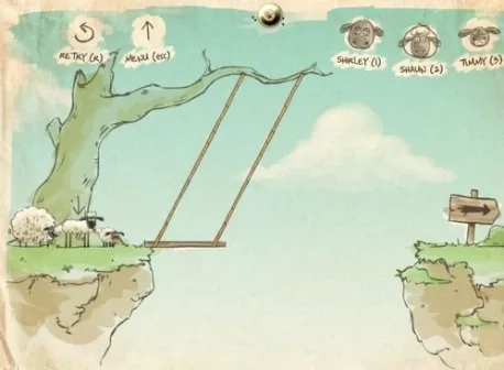 第3关:借助秋千荡到对面就能过关(要是秋千停了,只要站在上面的羊轻轻动一下,就能让它重新摆动起来)。