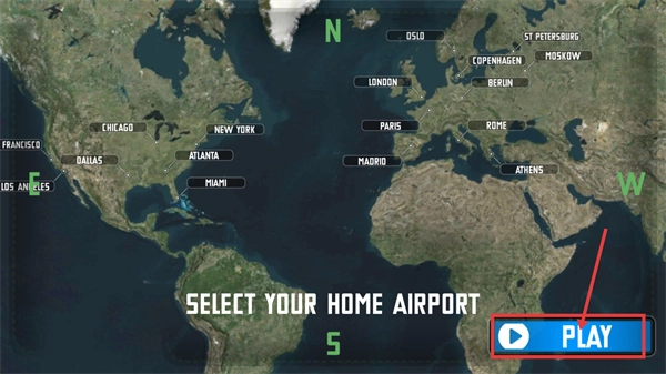 1、界面会显示【SELECT-YOUR-HOME-AIRPORT】提示,在选定好家乡机场后,点击【PLAY】按钮,就能进入游戏接下来的操作环节。