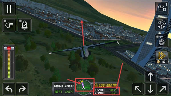 4、飞行过程中注意关注【H-SPEED-185-KM】【V-SPEED-10-KM】这两个参数,同时结合罗盘来调整飞行方向,确保保持正确的航线。