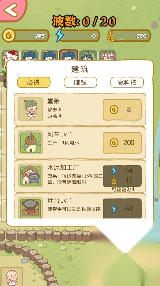 6、游戏内要打造完美阵容,需消耗金币来建造不同角色与各类建筑以抵御大鹅的攻击,其中建筑可分为必造、赚钱、高科技三大类型。