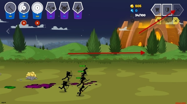 4、切换为进攻模式后,火柴人们将向敌方基地发起冲锋,向右滑动屏幕即可看到目标位置。