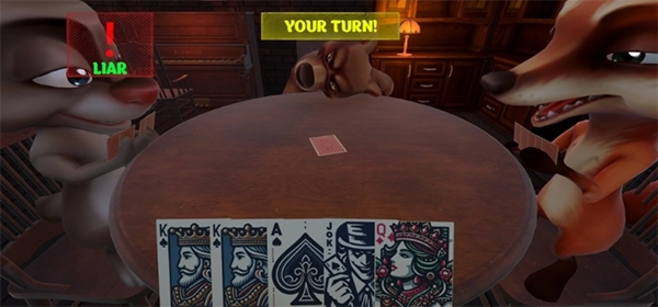 点击PLAY进入游戏,你将扮演一位角色(可能是猪头),在酒馆和三个哥们玩牌(目前暂时不支持联机),规则很简单,类似某国杀的于吉和东北的唬牌。你的目标是成为最后的赢家,活下来!
