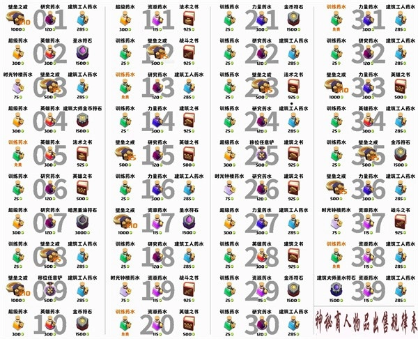 以下这张图表展示了神秘商店每日具体售卖的魔法物品清单。