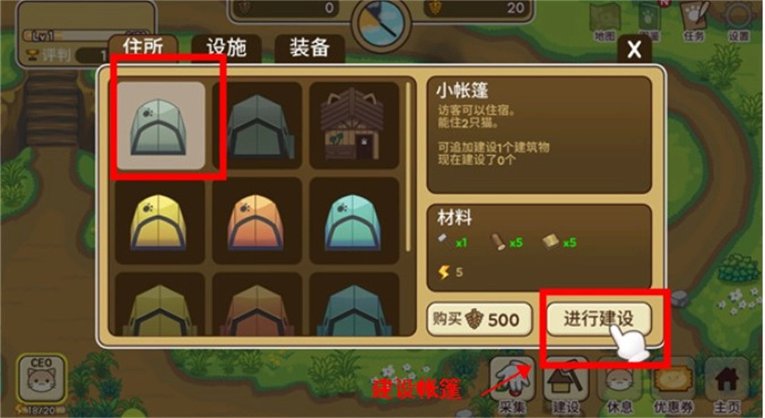 3、游戏内提供了各式各样的帐篷供玩家获取,玩家既可以通过建设的方式,也可以通过购买的途径来得到这些帐篷。