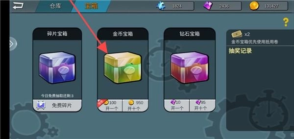 3、游戏内有【宝箱】系统,可在【仓库】界面选择【碎片宝箱】【金币宝箱】【钻石宝箱】等,消耗对应资源抽取奖励,提升游戏体验。