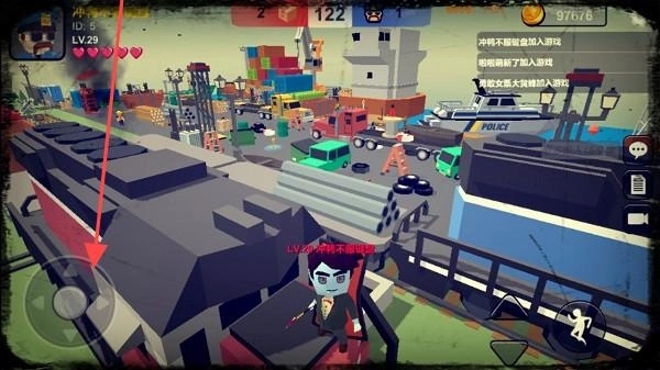1、在躲猫猫大乱斗游戏中,通过屏幕左下角虚拟摇杆控制角色移动,左上角显示角色ID、等级和生命值,上方显示游戏比分等信息。