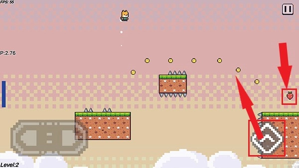 长按跳跃键能触发喷气效果,帮助小狐狸腾空飞起。玩家需把控好飞行方向,收集空中的金币;一旦成功获取草莓,即可顺利通关。