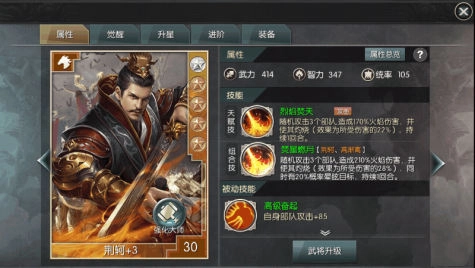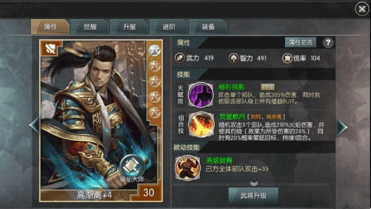 高渐离也是一名橙将,他的属性与技能和其他橙将相比其实没什么太大差异。之所以推荐他而非其他橙将,是因为他能和荆轲共同激活组合技“焚星燃月”。虽说这个组合技和前面提到的红将组合技比起来,打击目标只有三个,伤害也低了不少,但也还算不错了,毕竟红将的培养难度很大。
