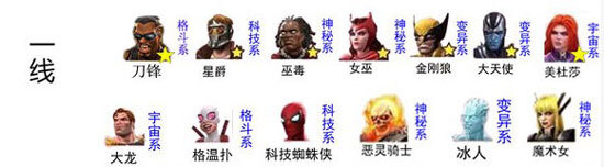 有刀锋、星爵、巫毒、女巫、金刚狼、大天使、美杜莎、大龙、格温扑、科技蜘蛛侠、恶灵骑士、冰人、魔术女