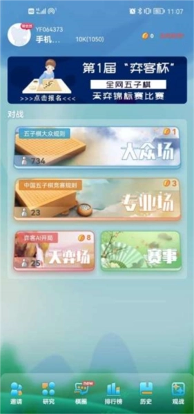 1、首先打开弈客五子棋手机版,进入游戏后,我们可以先选择进入大众场;