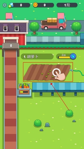1、持续点击图中所指的位置,即可完成作物的播种、浇水、光照和收割操作。