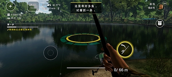 4、界面右下角设有抛竿按钮,待选定合适的垂钓位置后,点击该按钮即可完成抛竿操作。