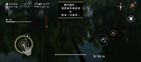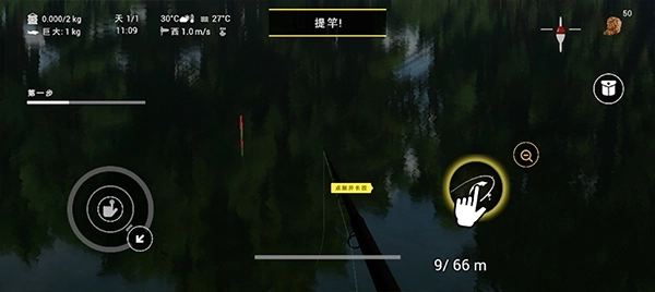 5、耐心等待便能让鱼儿上钩,浮标有动静时,可点击右下角的放大键放大浮标以观察其动向,手机振动意味着有鱼上钩,收钩太晚容易让鱼逃脱。