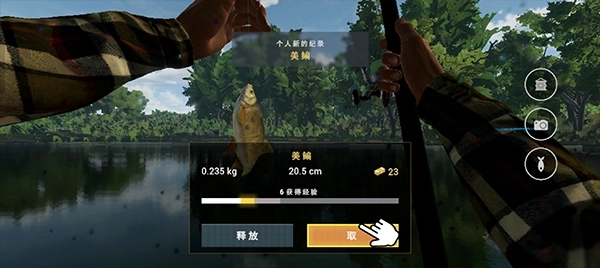 7、在鱼儿再次咬钩的瞬间,需快速长按右下角与左下角的按键,如此便能顺利钓获一条鱼。