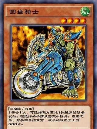 回过头来,我们再聊聊圆盘骑士的效果。这张卡片的效果1回合仅能发动1次,具体是选择我方墓地中的1张通常陷阱卡来发动,被选中的卡牌会从游戏里除外,紧接着,在对手回合结束之前,这张卡的攻击力会提升500点。需要注意的是,该卡的攻击上升效果无法叠加,但考虑到这款游戏的血量上限仅为4000,这样的加成幅度其实已经相当可观了,适合搭配一些其他高攻击力的卡组一同使用。