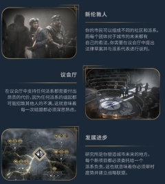 市民们期望在城市管理运营事务上能够发表自己的意见。各个派系不仅拥有独特的意识形态,对于未来也有着各自的构想,然而它们却存在一个共通之处——对权力有着无穷无尽的渴望。你得在议会厅里慎重地挑选盟友。