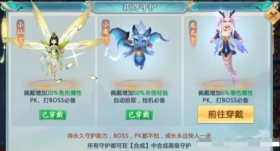 小仙女:佩戴后可提升20%的免伤效果,无论是切磋对战还是挑战BOSS都必不可少。