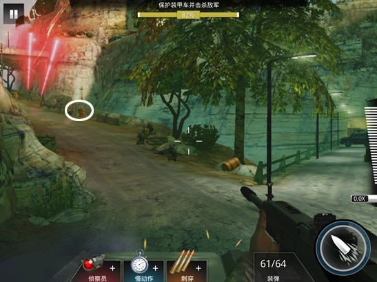 狙击手是很好辨识的,他们在寻找目标时,武器会有红色射线光。另外,如果地图中有油桶,图中画圈的部分,油桶爆炸可以炸死附近的士兵,在后面的其他任务也是如此。(如下图)