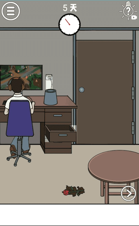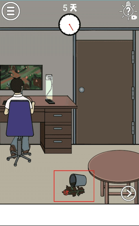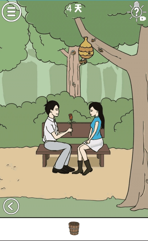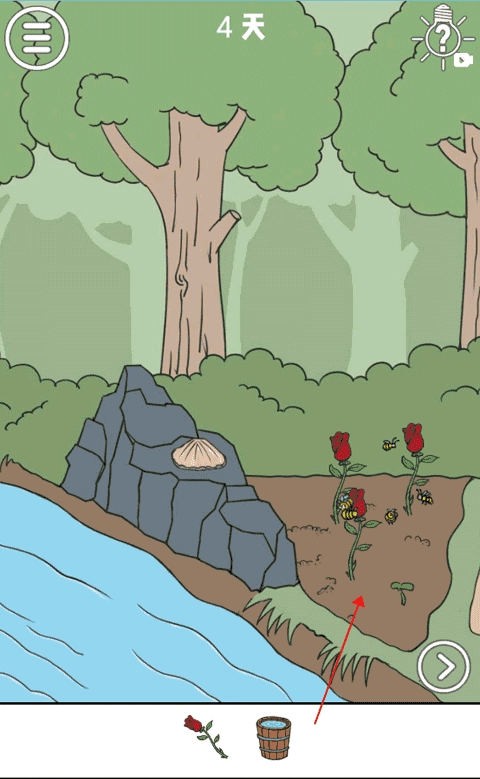 在这一场景的右下角,也就是大树的脚边,有一个水桶,将这个水桶拿起来,去河边打一桶水,然后将这通水浇在旁边的玫瑰花地中。然后会得到玫瑰花,这时候不要停,继续往这个玫瑰花地中胶水,直到这片玫瑰花枯萎,然后将玫瑰花给男子就可以完成本关啦!