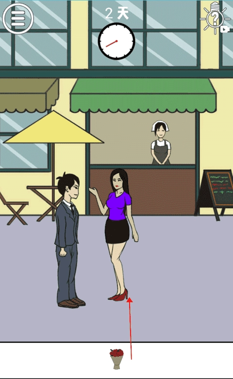 首先,在这一场景中有一个穿紫色衣服的女人,找到那个女人,将她移动到男人的前面,如图所示,再将鲜花给予这个女人,就可以完成这一关啦!