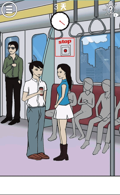 这一关非常的简单,在地铁门前站着一个男子各位看见没有?他手里拿着一杯咖啡呢、点击将他的咖啡给拿走,然后将他的咖啡给这个穿白色上衣的男子,接着再点击红色“stop”标记下的按钮紧急停车就可以拆散这一关中的情侣啦!