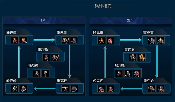另外一个要点是兵种之间的克制关系。因为玩家需要考虑兵种克制的因素,所以如何选择和派遣部队就成了一个需要仔细琢磨的问题。现在比较主流的出兵策略是采用15人口的配置,通常的搭配是6个一阶兵、5个二阶兵、3个三阶兵和1个四阶兵(这里的一阶兵指所有单个占用1人口的兵种,二阶兵是单个占用2人口的兵种,三阶兵则是单个占用4人口的兵种)。不过要特别注意,那些会对经济发展造成过大负面影响的出兵套路,最好还是避免使用。