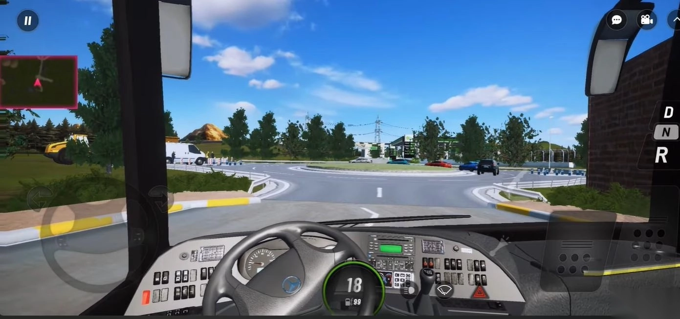 4、游戏过程中,左侧的方向盘用来操控行驶方向,右侧的按键则掌管加速和减速。屏幕下方的绿色区域会展示当前的车速与油量,左侧的红色区域则是实时的地图信息。