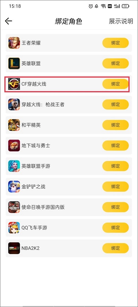 挑选好你想绑定的游戏,接着点击右侧的绑定按钮,输入游戏对应的大区、服务器以及角色信息即可完成绑定。