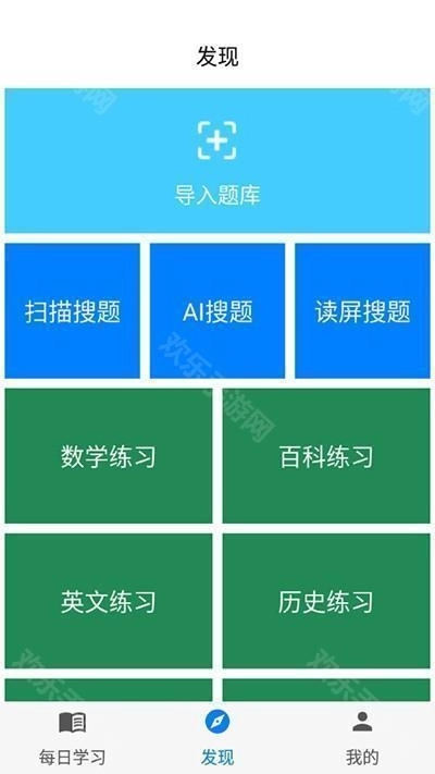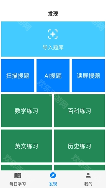 3、在发现模块可以自由导入题库、还饿可以扫描搜题、AI搜题、读屏搜题等等,还可以选择联系题目类型,非常强大。