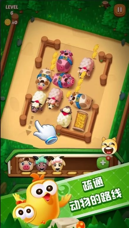2、缓解压力,关卡难度会逐步提升,通关需要运用技巧与思考,游戏的核心目标是解锁农场围场里的全部动物并将它们释放。