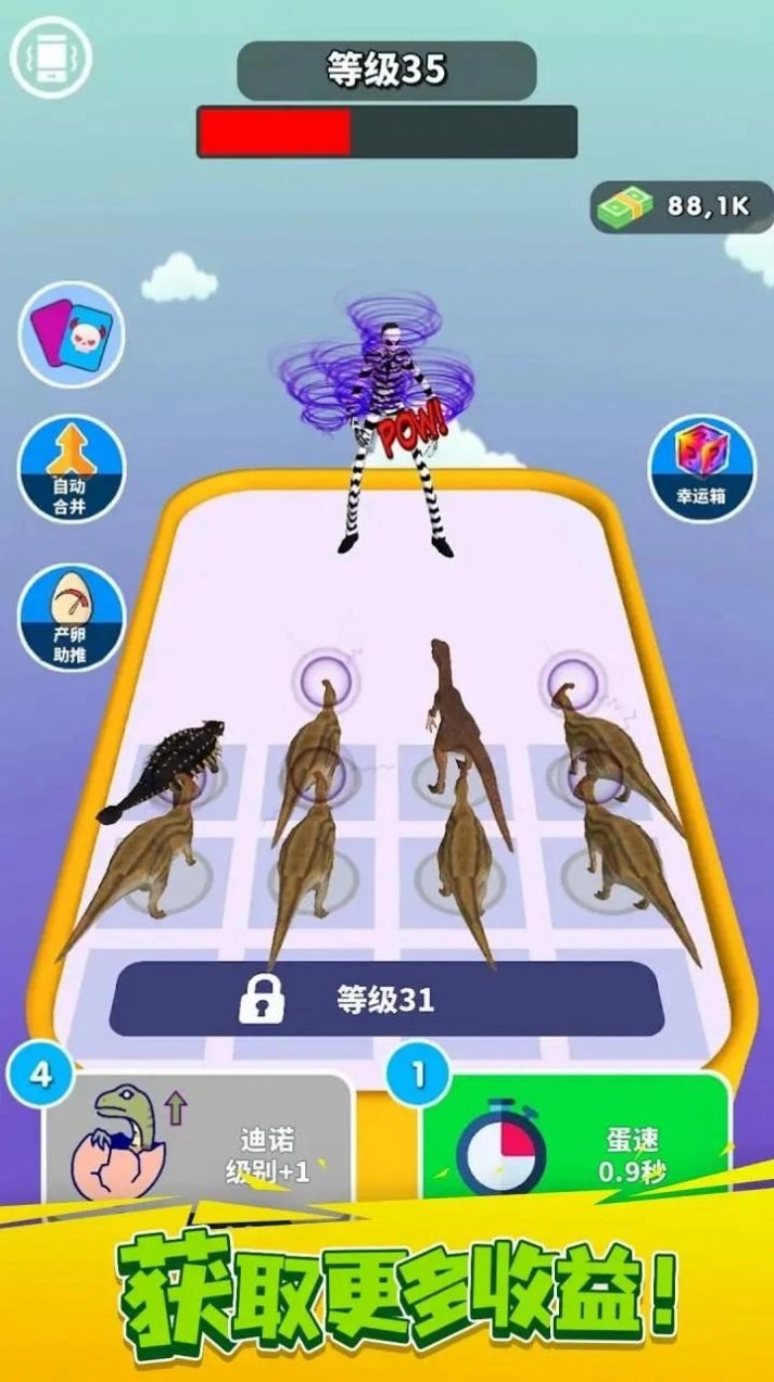1.操作简便,只需放置即可;相同的恐龙可合并进化,收获后能赚取金币。