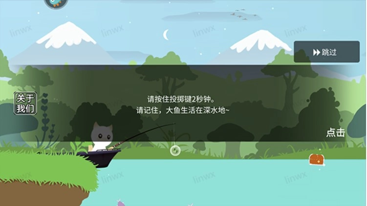 2、长按投掷按钮大约两秒钟,把鱼钩甩到水面外,即可开始钓鱼。