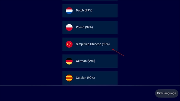 1、进入游戏之后首先选择语言,找到中文语言点击。