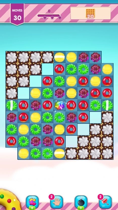 2.玩家需让相同的甜甜圈一同移动,以此消除三个及以上的甜甜圈。