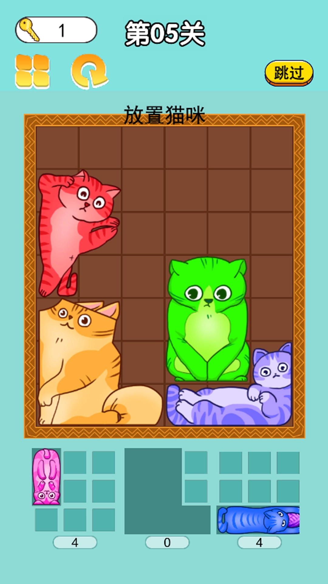 1、所有不同形状的方块均以猫咪形象为设计灵感,需将它们合理放置到指定区域内。