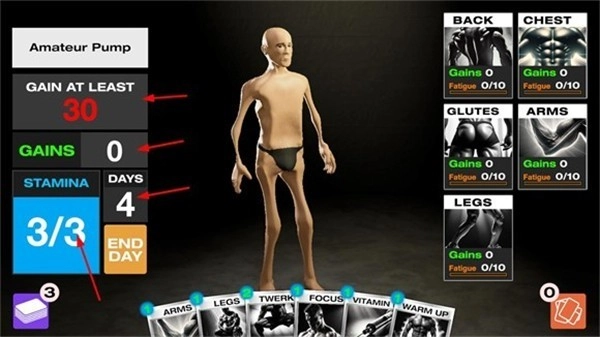 2、右侧展示了身体不同部位的肌肉数量,每张卡牌可提升的肌肉量存在差异,合理运用这些卡牌十分关键。