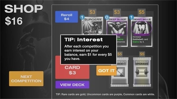 5、比赛获胜后将得到金币奖励,这些金币能够用来购买新的训练卡牌,以便继续挑战实力更强的对手,朝着成为健身冠军的目标不断前进。