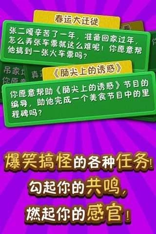 1、任务模式:“春运大迁徙”,“肠尖上的诱惑”,“盗墓笔记”,“上班族的早餐”等30个光怪离奇的剧情任务,勾起你的共鸣,燃起你的感官!