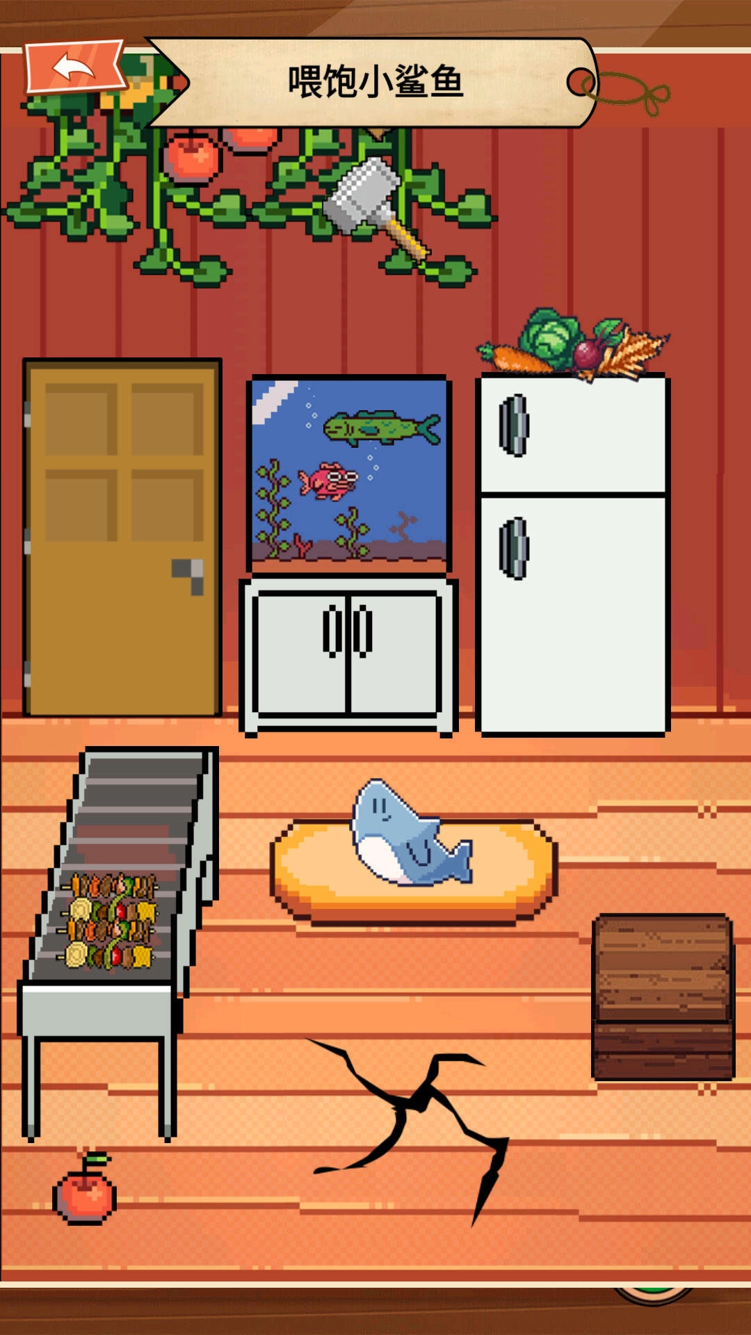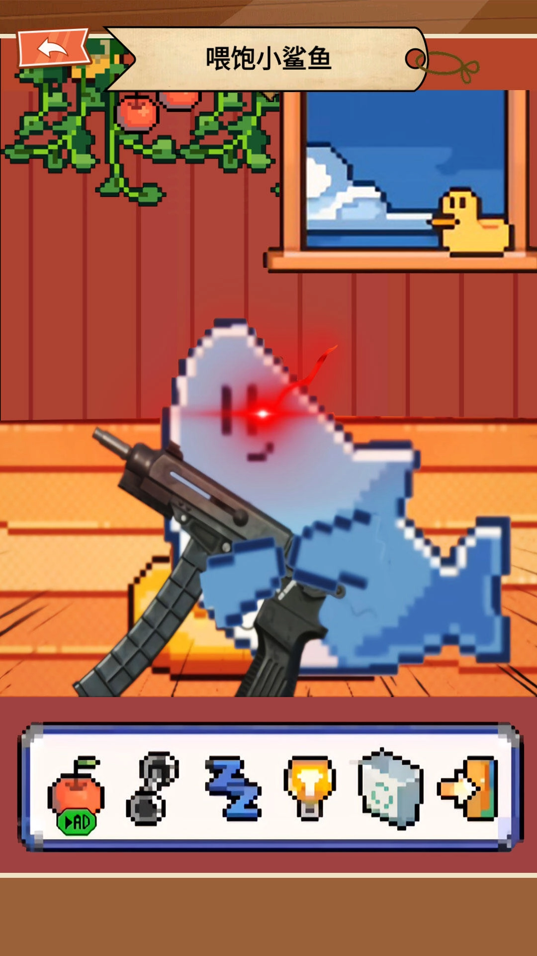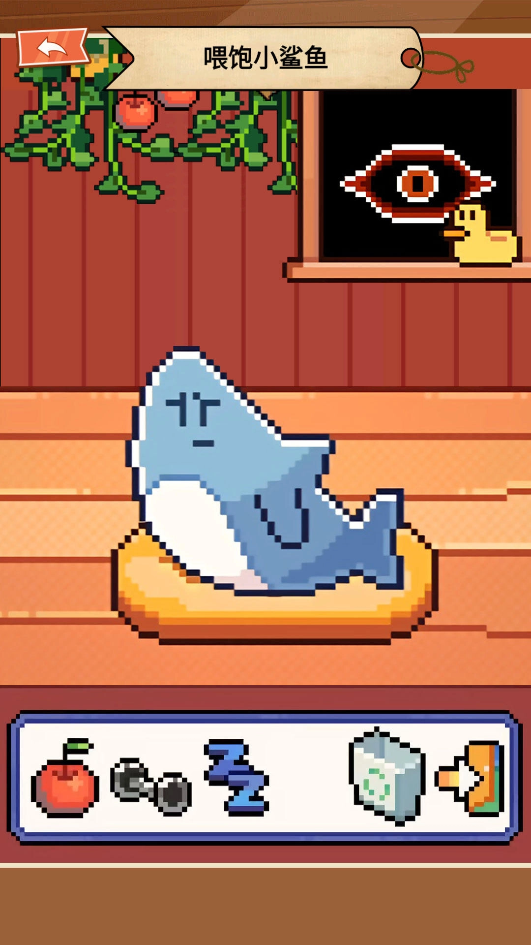 1、通过喂食、洗澡、玩耍等方式照顾像素鲨鱼,让它健康快乐成长;